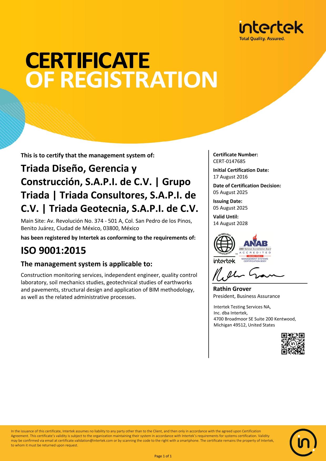Es compromiso de todo el personal de Grupo Triada proporcionar servicios de calidad, dedicando su amplia capacidad profesional y experiencia, utilizando tecnología de vanguardia, y cumpliendo con la normatividad aplicable, a fin de satisfacer las necesidades del cliente y mejorar de manera continua su Sistema de Gestión de Calidad basado en la Norma ISO-9001:2015, con acreditación en la Norma NMX-EC-17025-IMNC-2018.